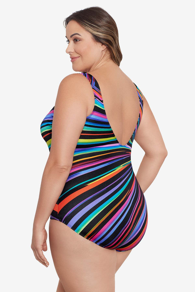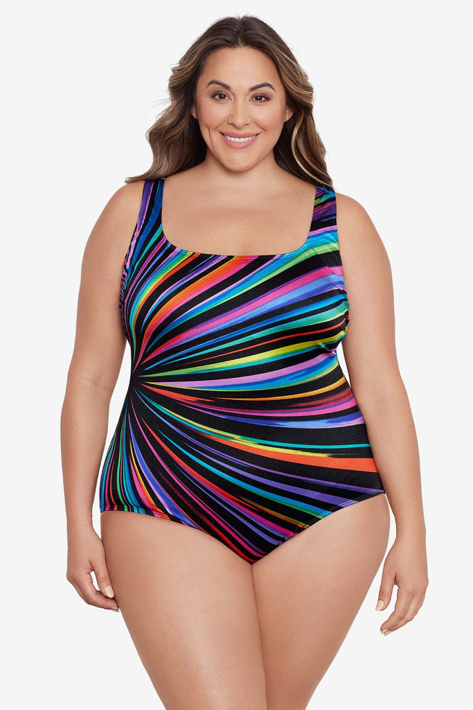 Inner firming shapewear in each Longitude swimsuit offers all day comfort while colorful prints and signature solid black styles grace this ageless swimwear. A longer length and finer fit enhance all figures, embracing confidence within.
