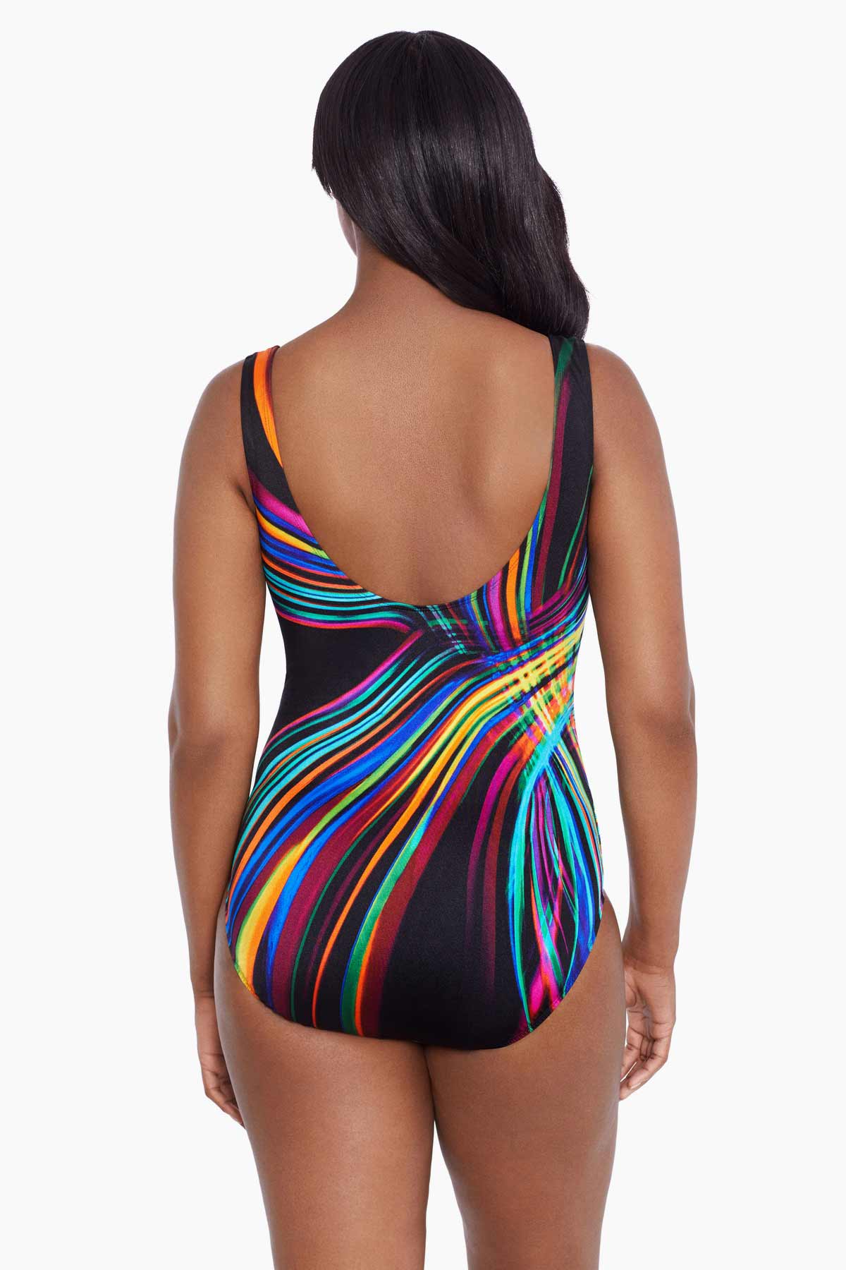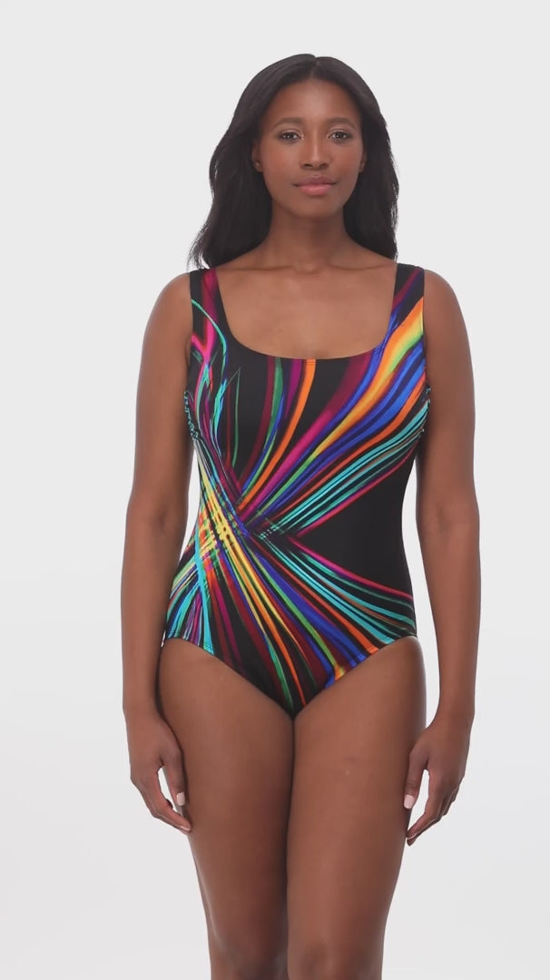 Inner firming shapewear in each Longitude swimsuit offers all day comfort while colorful prints and signature solid black styles grace this ageless swimwear. A longer length and finer fit enhance all figures, embracing confidence within.