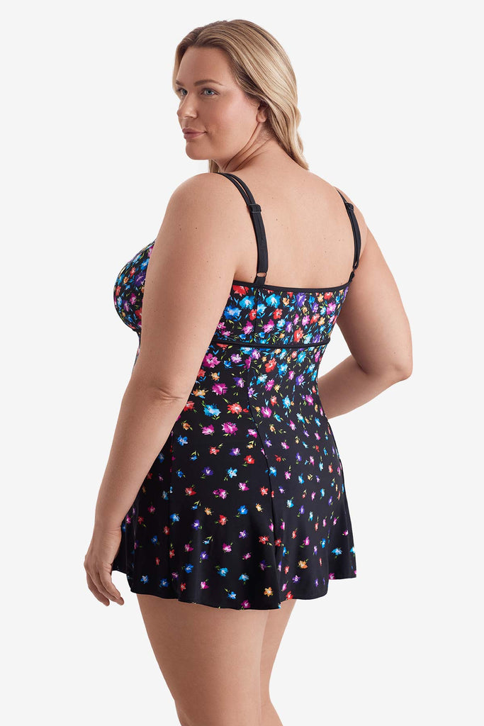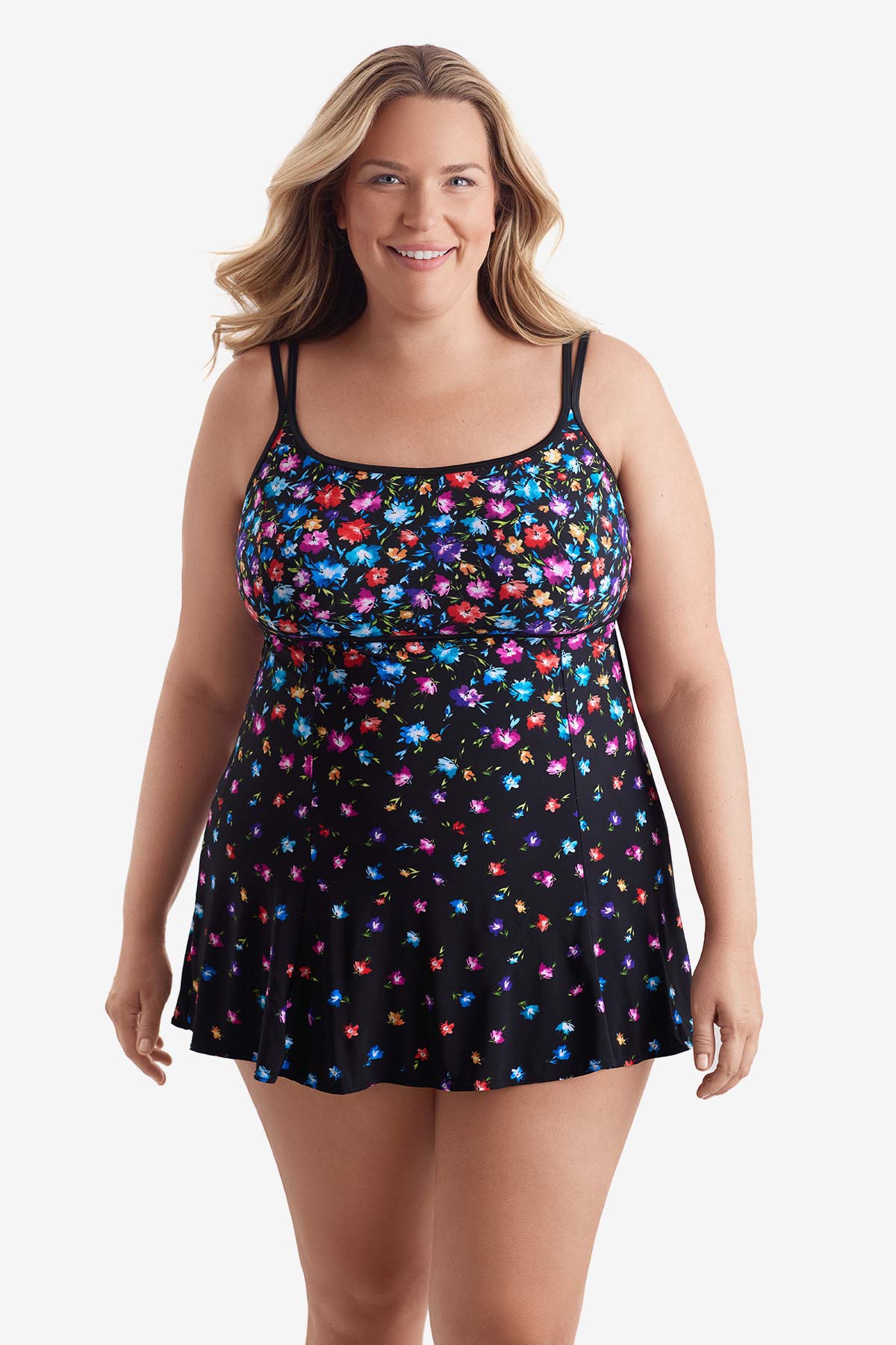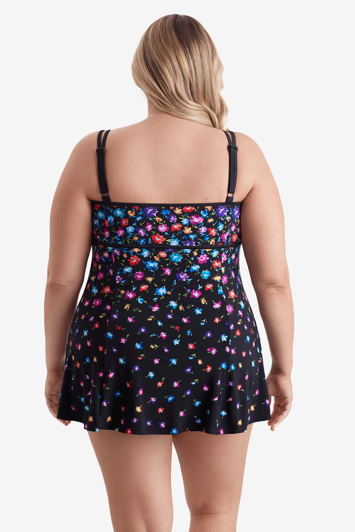 Plus Size Long Torso Empire Princess Seam Swim Dress - Flower Trail
