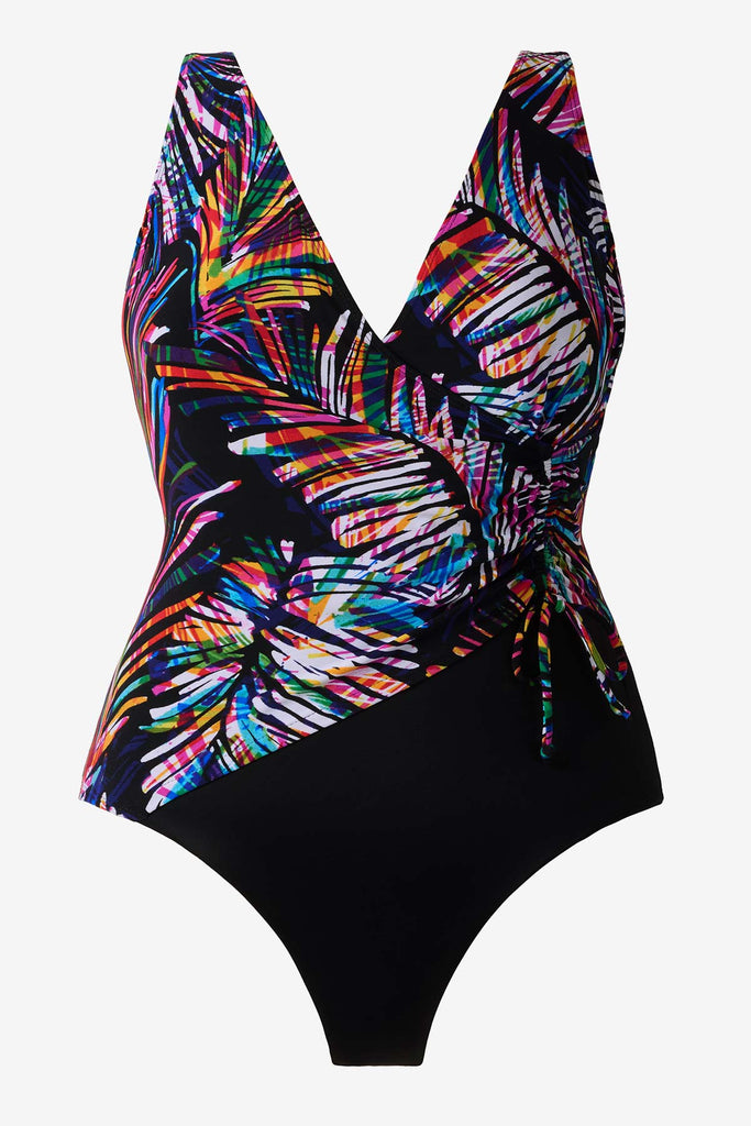 A little twist, a little shirring, and a whole lot of style. This endlessly flattering surplice one-piece features a faux tie detail that cinches your waist just right, paired with a modern leg cut for a fresh, bold look. In vibrant multi-color prints, it makes every swim feel like a getaway — just add sunshine.