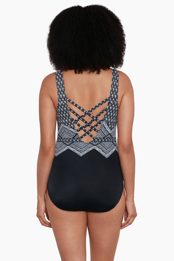 Turn heads in this ultra-flattering swimsuit with a bold strappy X-back and a sleek tank top silhouette. Whether you're lounging poolside or diving in, this printed one-piece offers the perfect balance of comfort, support, and style.