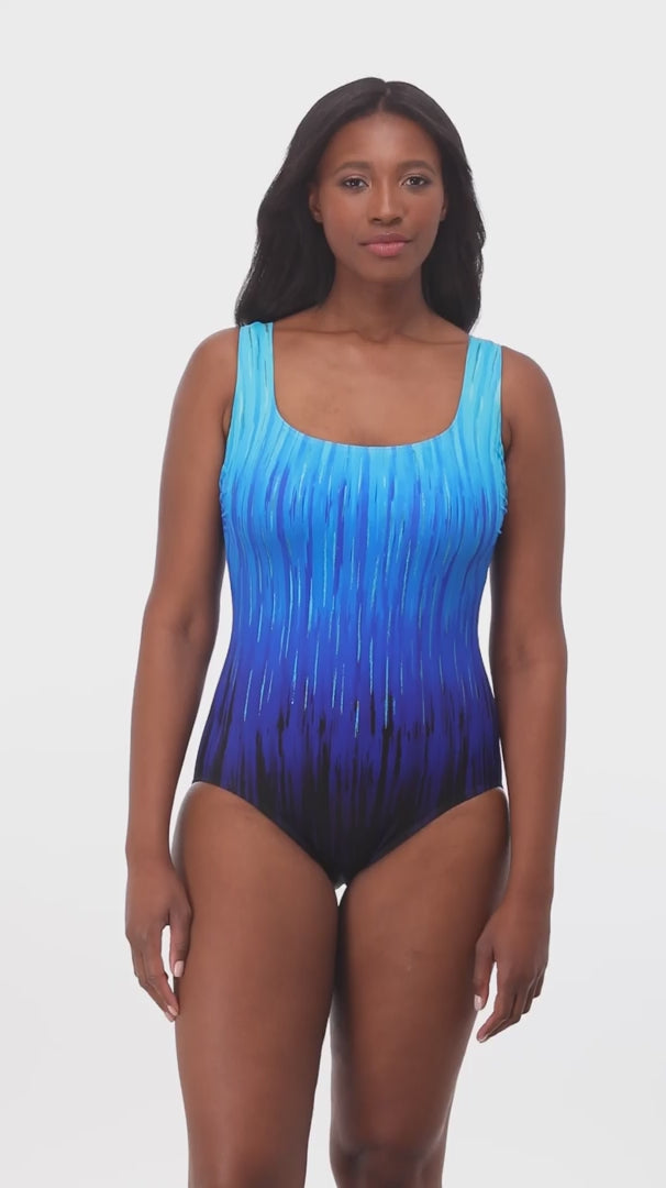 Inner firming shapewear in each Longitude swimsuit offers all day comfort while colorful prints and signature solid black styles grace this ageless swimwear. A longer length and finer fit enhance all figures, embracing confidence within.