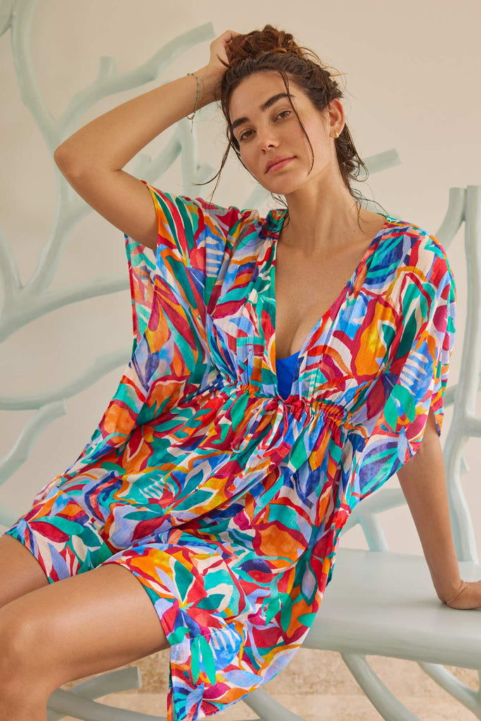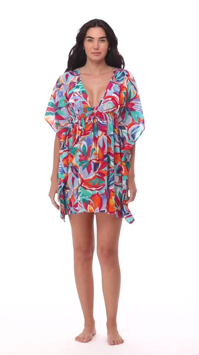 • Mini caftan cover-up with a flowy fit and flattering tie waist