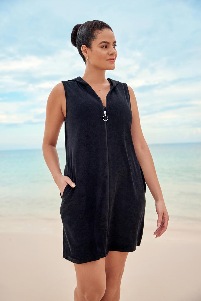 Hooded Zipper Terry Swim Cover Up - Black
